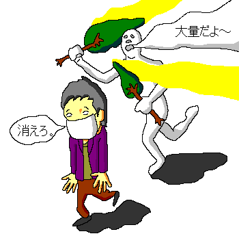 | 2004/12/21 「睡魔は時間泥棒。」 寝るつもりもないのにゴロゴロしていたら寝てしまっていました。気づいたら一時間半ほど時間がたっていて、時間を損した気分になりました。平均睡眠時間8時間も寝ているのに昼寝をしてしまう体が憎い…。 2004/12/22 「少し早めの…。」 我が家では少し早めにクリスマスケーキを食べました。 200412/25 「死んだように…。」 2日更新しなかった間にしたこと。 22日の夜から朝までボーリング6ゲーム。 死んだように寝る。 23日の昼から24日の朝まで友人宅で西武ライオンズ優勝祝勝会。 死んだように寝る。 24日の夜から朝までボーリング8ゲーム。 死んだように寝る。 こんな感じした。ていうか、ボーリングやりすぎで人間がピンに見えてきました。 2004/12/26 「ひっくり返せない。」 自分でホットケーキを作ったらひっくり返せないので「ヤバイなぁ。」と思っていたら本当に焦げそうになったので、思い切ってひっくり返したら途中で、「グチャッ」ってなりました。 変な形のホットケーキを自分で全部食べましたよ。 2004/12/27 「杉良太郎・杉量大量。」 来年の花粉の量は半端じゃいないそうです。殺人的なクシャミの連発と鼻づまりと目のかゆみが襲ってくるかと思うと憂鬱です。 バイトをしていた時なんてレジ打ちの最中にクシャミが出たりして大変でした。鼻にティッシュ突っ込んでマスクして仕事をしていました。 花粉シーズンだけ杉のない国に行って生活したいです。 2004/12/28「音痴ですから!残念!」 部屋の片隅においてあるギターを見たらホコリまみれで、なんか可哀相になってきたので久しぶりに弾くことにしました。 で、弾き語りを始めたら音程がとれなかったので 「俺、音痴になったなぁ…。」 と思ったら、弦のチューニングをしていないことに気づきました。 チューニングしたら音痴じゃなくなったのでよかったです。ていうか、久しぶりに弾いたら指の皮が剥けて指先がヒリヒリしてきました。 2004/12/29 「雪が舞い降りた。」 雪が少しだけ降りました。 アスファルトに少しだけ積もりました。 景色が少しだけ明るくなりました。 車や人々が通り、雪は消えてしまいました。 いつもの景色に戻りました。 そんな日でした。 2004/12/30 「あと二つ寝るとお正月。」 ![]() またまたボーリングをしました。しかも8ゲームも。今年最後の投球でストライクが出てうれしかったです。 そのあと、スーパーに行き買出しの手伝いをしました。おばちゃんだらけで、すごい熱気に包まれていました。 今日の絵は「PictBear Second Edition」で描いてみました。以前もこのソフトで描いて使い方がわからずに失敗しましたが、今回はいろいろいじくっているうちに基本的な描き方がわかってきました。これからは、ペイントとPictBearを併用して行こうと思います。 |